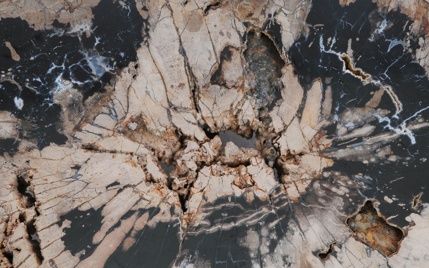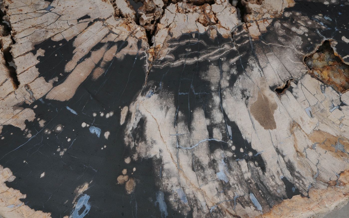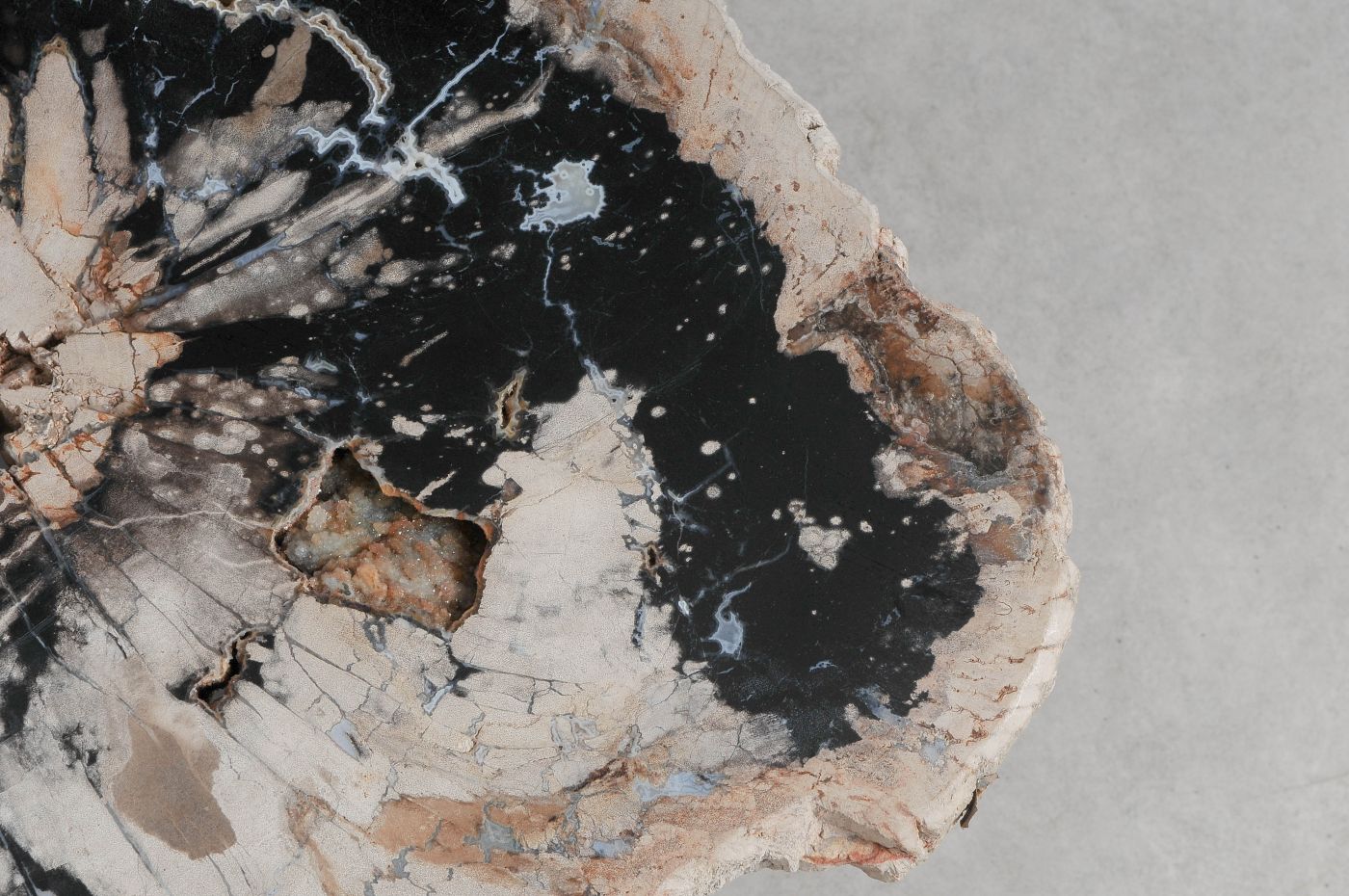 Deze unieke salontafel van versteend hout past in ieder interieur. Het tafelblad is gezaagd uit een grote versteende boom, die ongeveer 20 miljoen jaar geleden geleefd heeft. De kleuren zijn bepaald door de mineralen die het hout van deze boom vervangen hebben.
