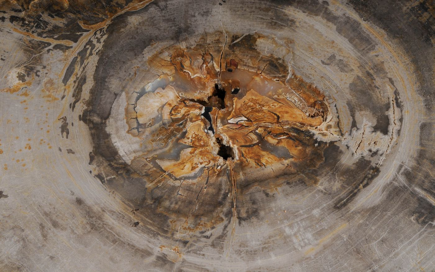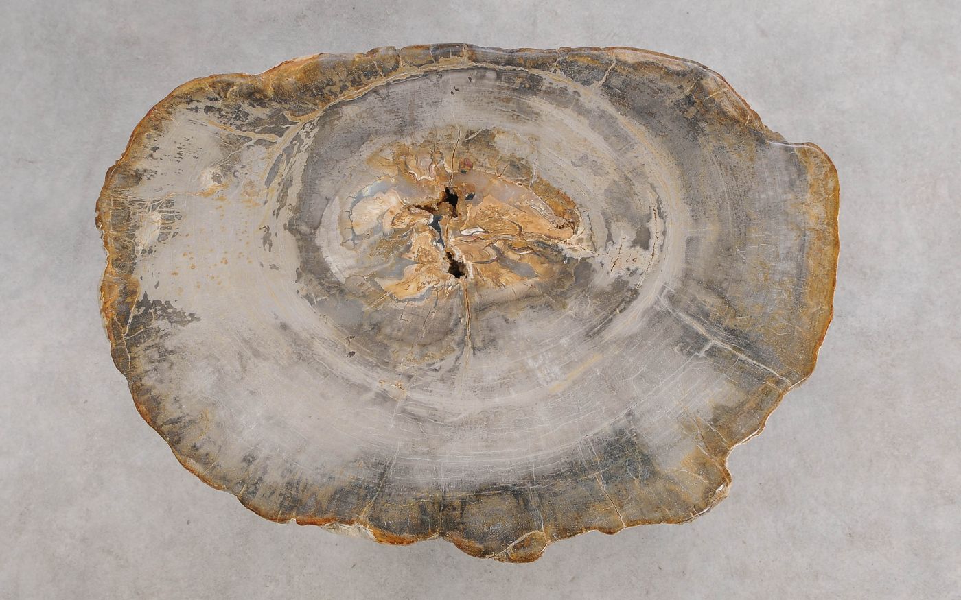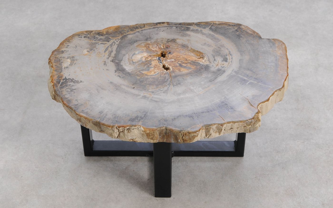 Deze unieke salontafel van versteend hout past in ieder interieur. Het tafelblad is gezaagd uit een grote versteende boom, die ongeveer 20 miljoen jaar geleden geleefd heeft. De kleuren zijn bepaald door de mineralen die het hout van deze boom vervangen hebben.