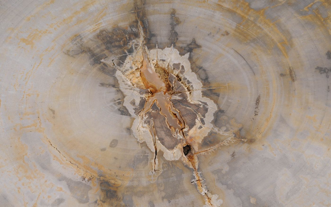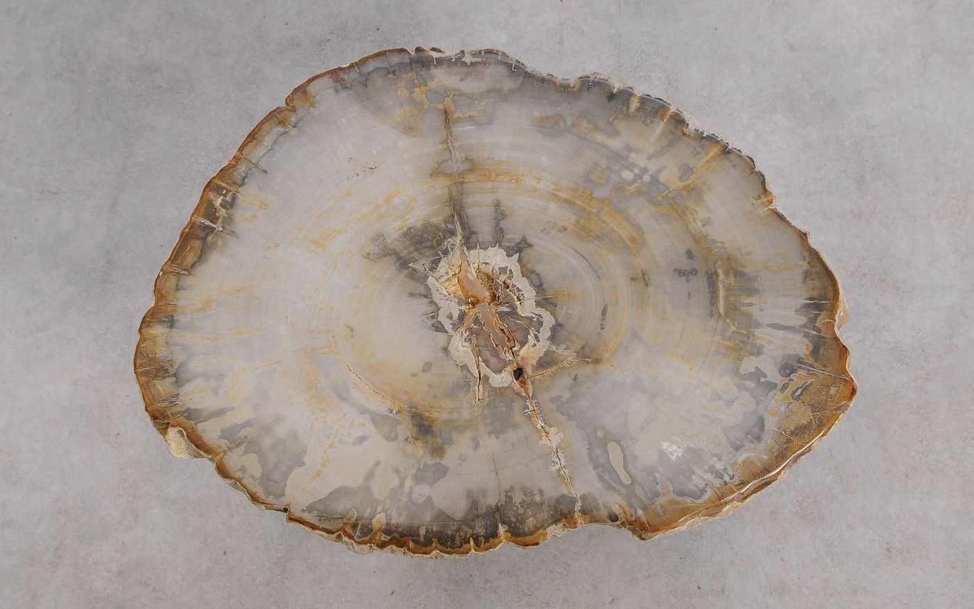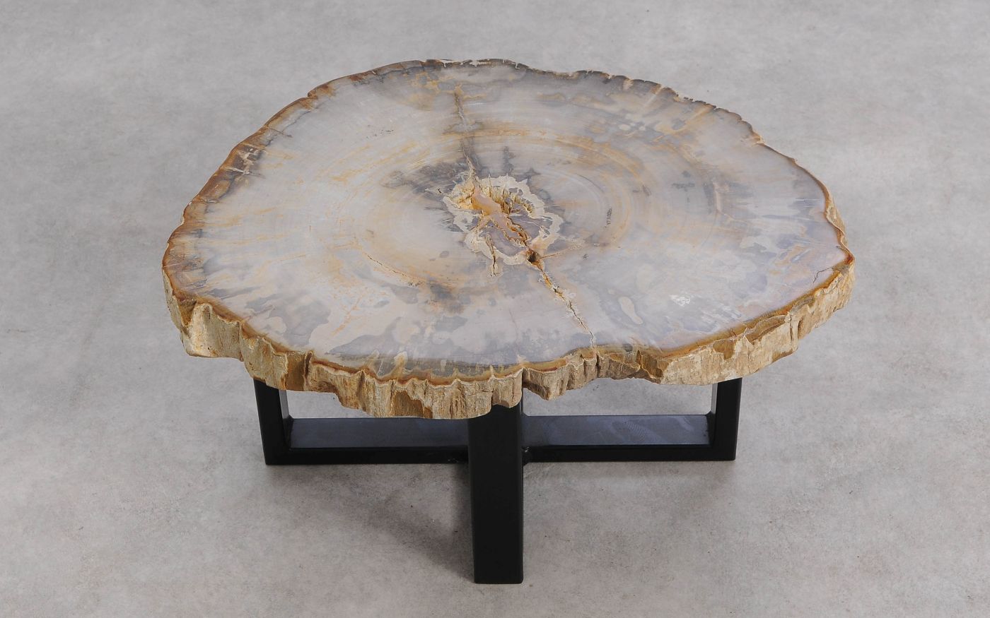 Deze unieke salontafel van versteend hout past in ieder interieur. Het tafelblad is gezaagd uit een grote versteende boom, die ongeveer 20 miljoen jaar geleden geleefd heeft. De kleuren zijn bepaald door de mineralen die het hout van deze boom vervangen hebben.