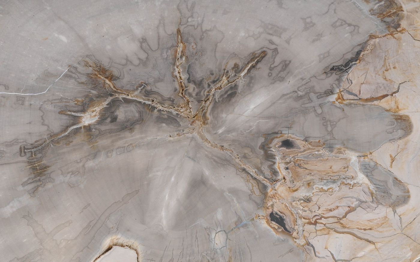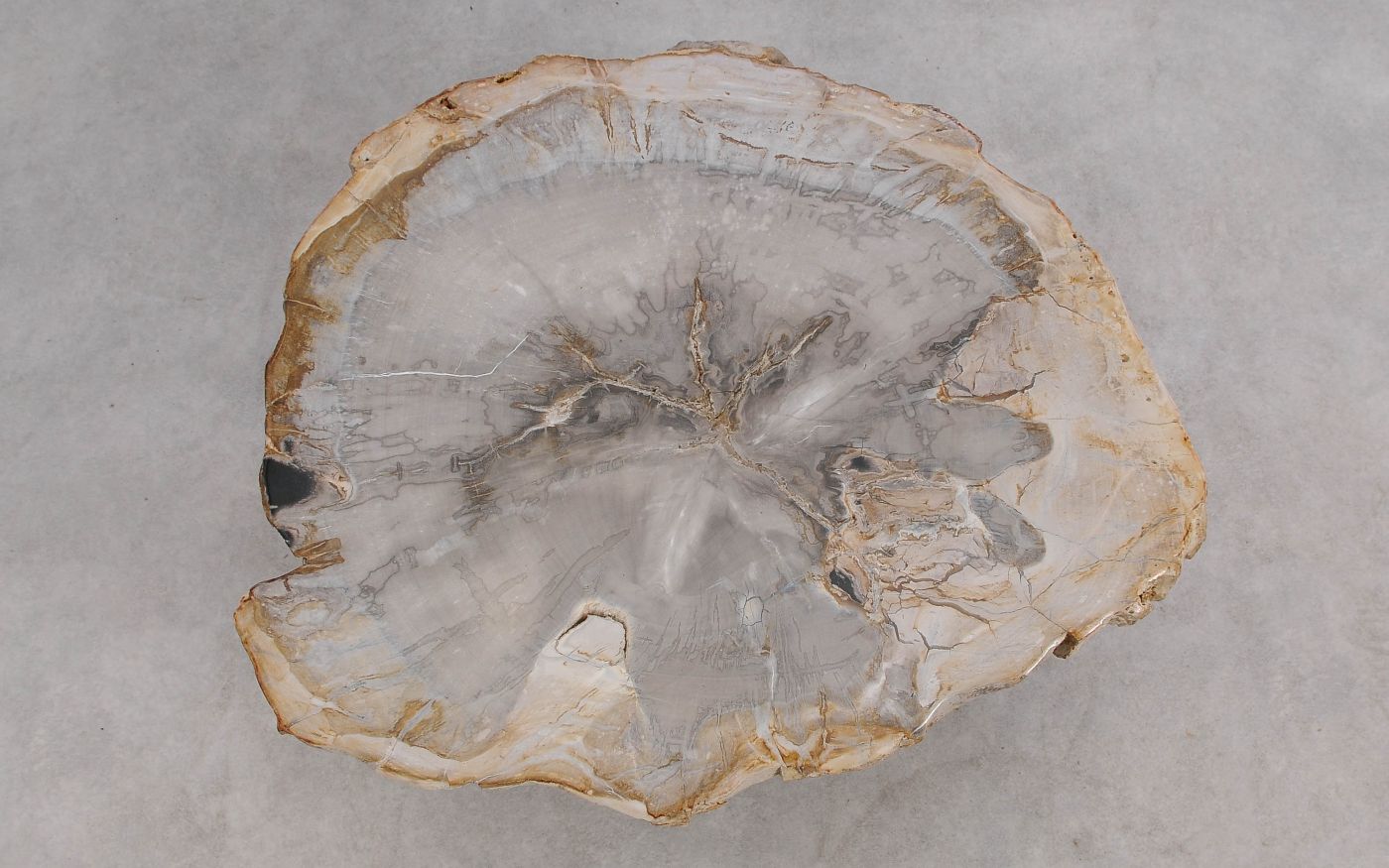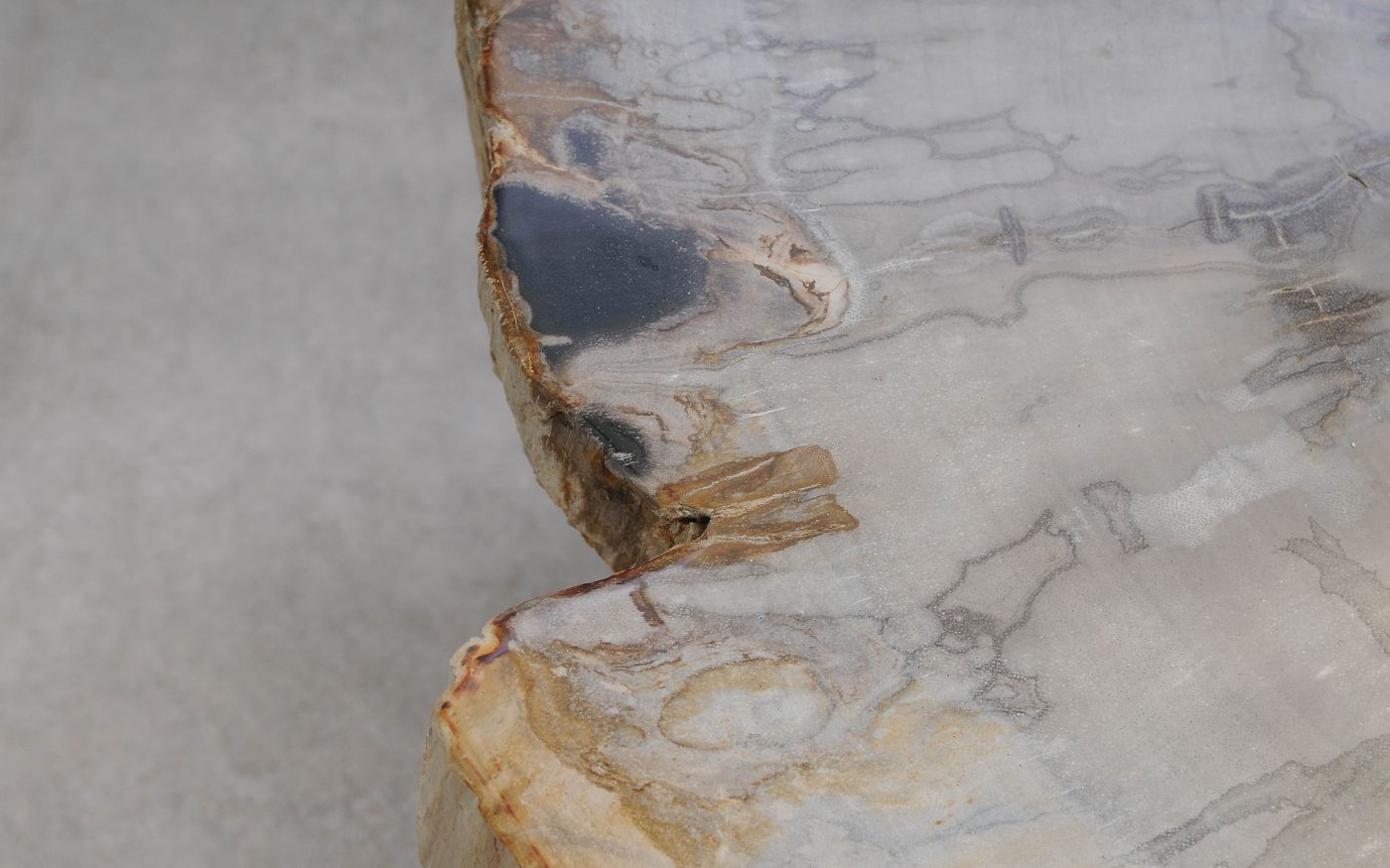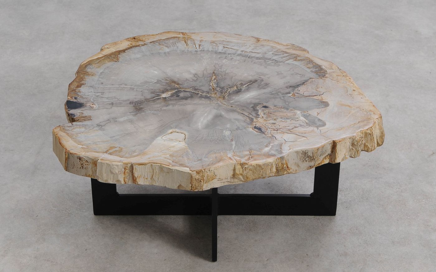 Deze unieke salontafel van versteend hout past in ieder interieur. Het tafelblad is gezaagd uit een grote versteende boom, die ongeveer 20 miljoen jaar geleden geleefd heeft. De kleuren zijn bepaald door de mineralen die het hout van deze boom vervangen hebben.