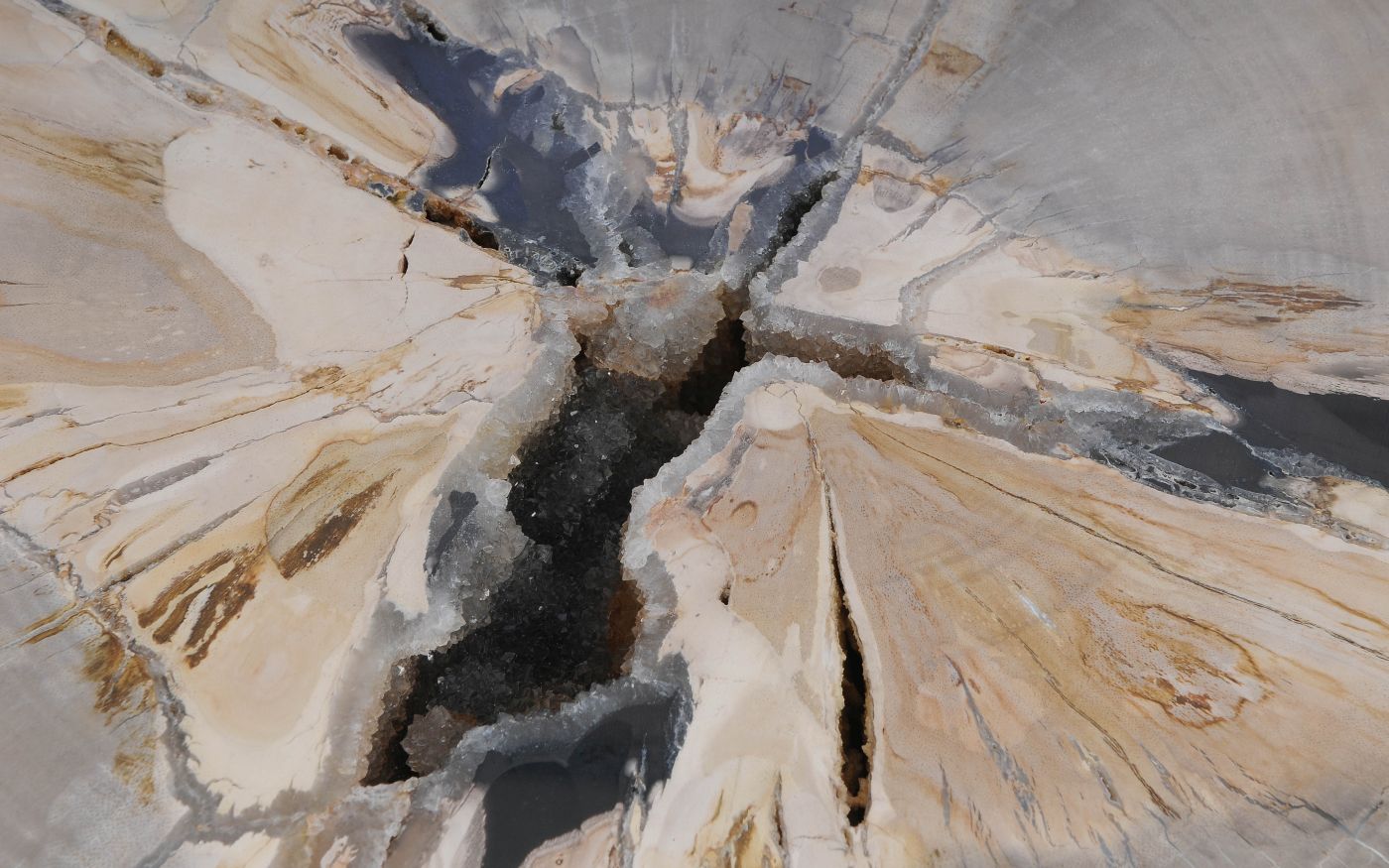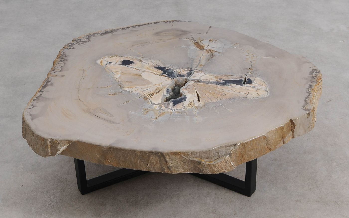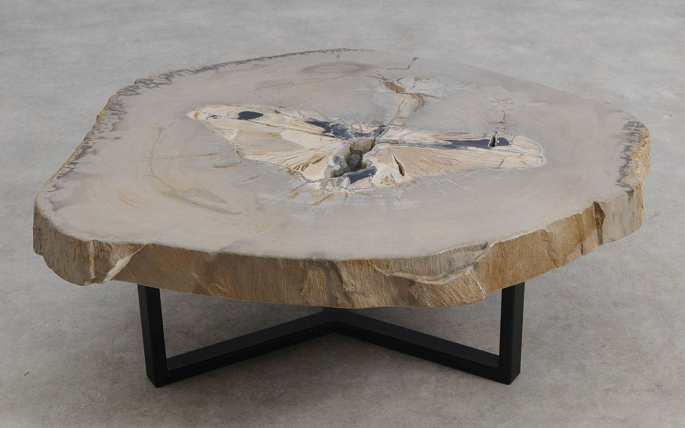 Deze unieke salontafel van versteend hout past in ieder interieur. Het tafelblad is gezaagd uit een grote versteende boom, die ongeveer 20 miljoen jaar geleden geleefd heeft. De kleuren zijn bepaald door de mineralen die het hout van deze boom vervangen hebben.