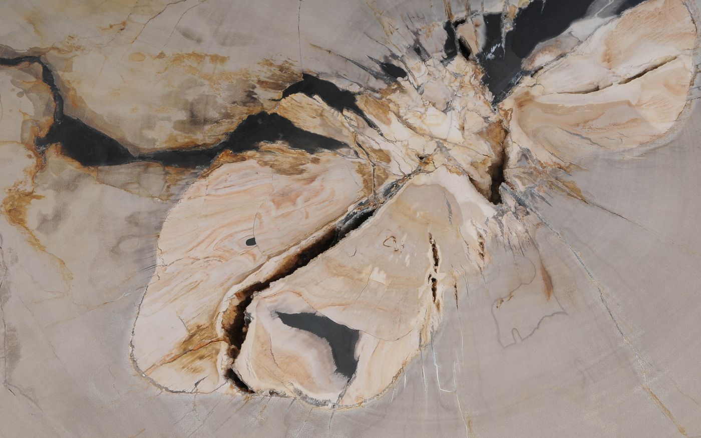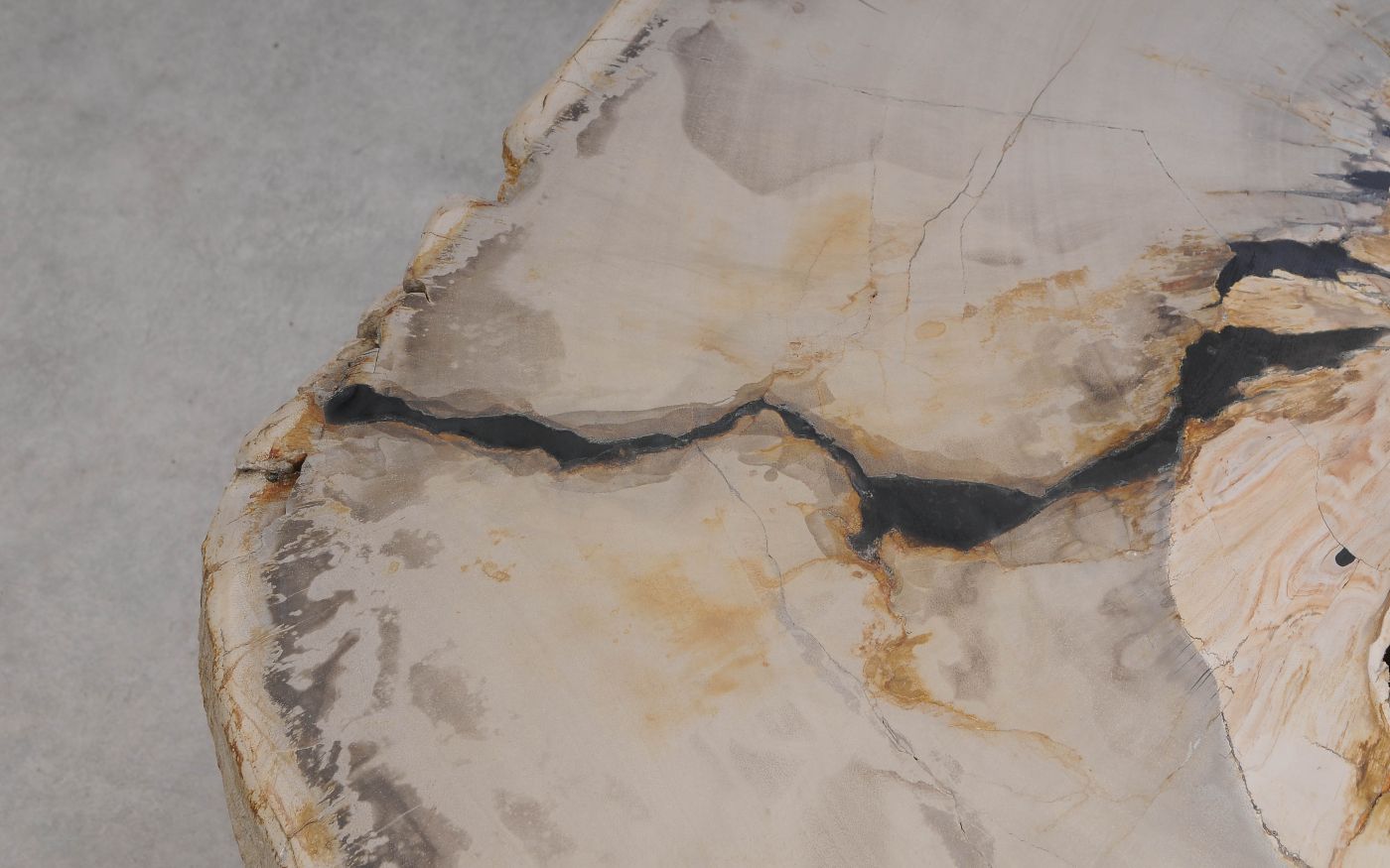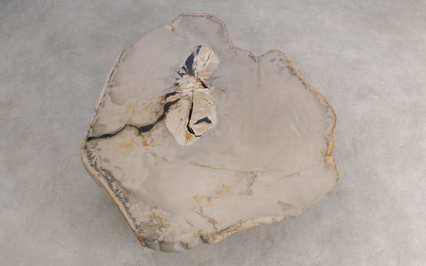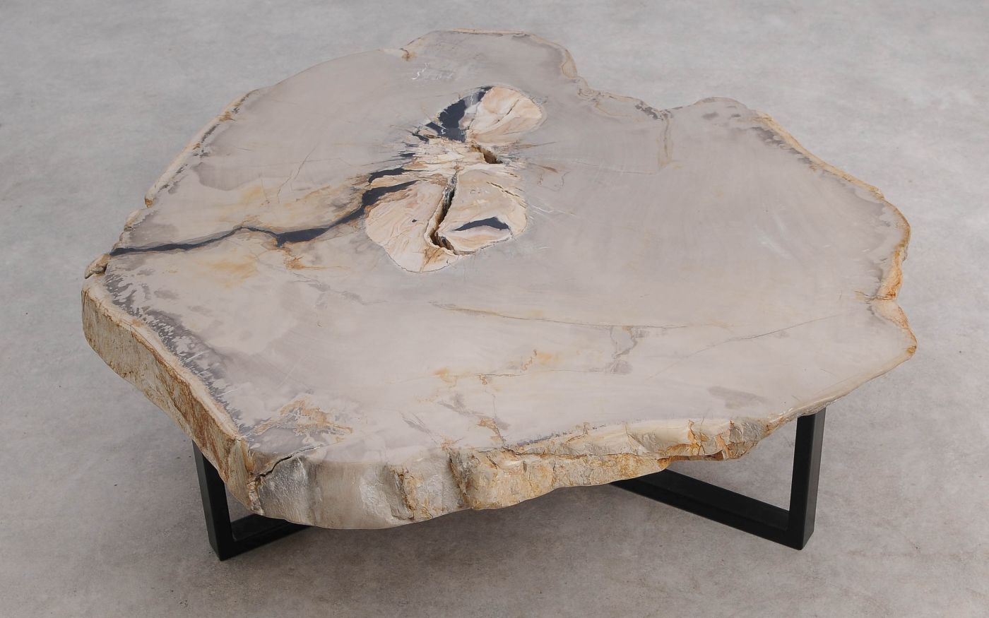 Deze unieke salontafel van versteend hout past in ieder interieur. Het tafelblad is gezaagd uit een grote versteende boom, die ongeveer 20 miljoen jaar geleden geleefd heeft. De kleuren zijn bepaald door de mineralen die het hout van deze boom vervangen hebben.