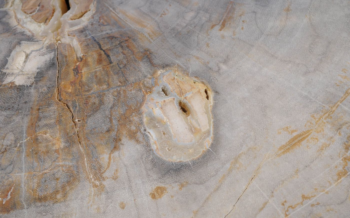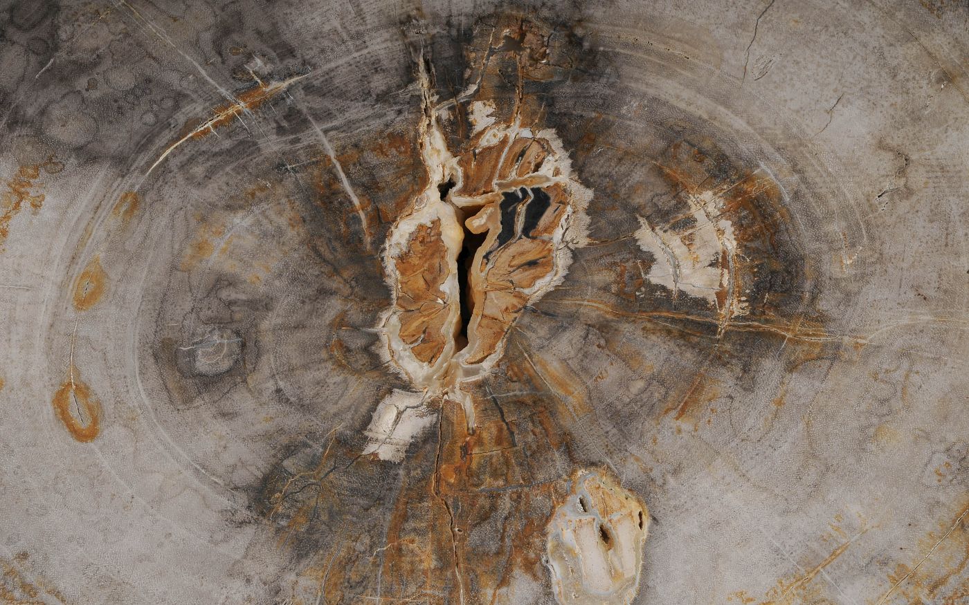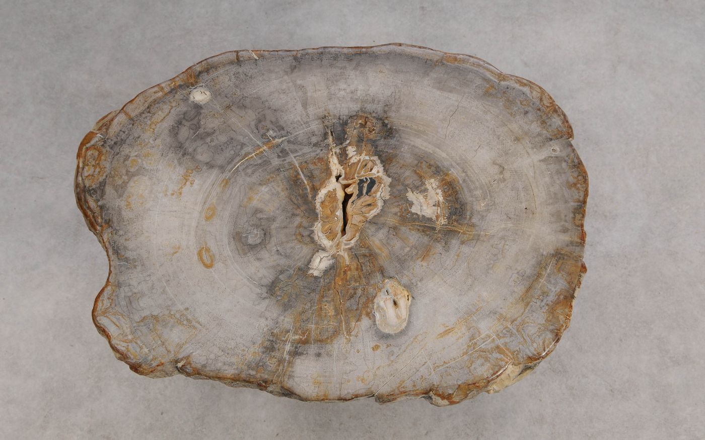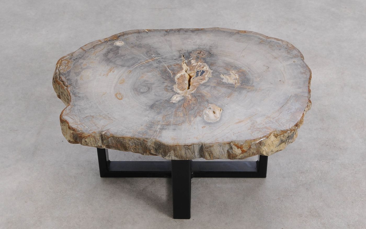 Deze unieke salontafel van versteend hout past in ieder interieur. Het tafelblad is gezaagd uit een grote versteende boom, die ongeveer 20 miljoen jaar geleden geleefd heeft. De kleuren zijn bepaald door de mineralen die het hout van deze boom vervangen hebben.