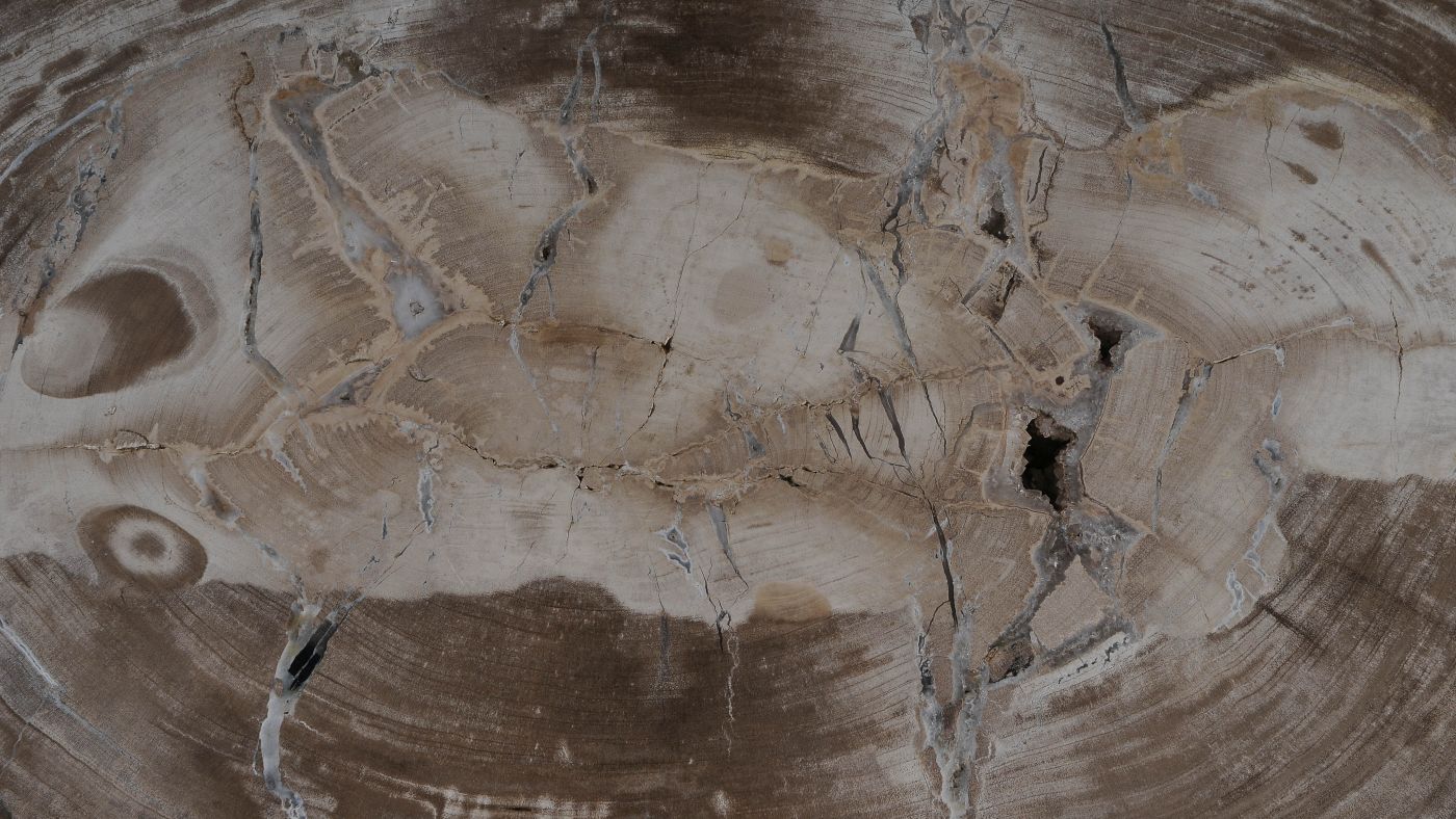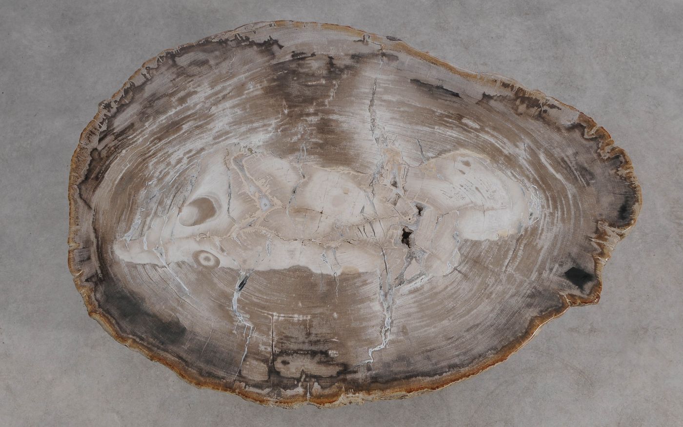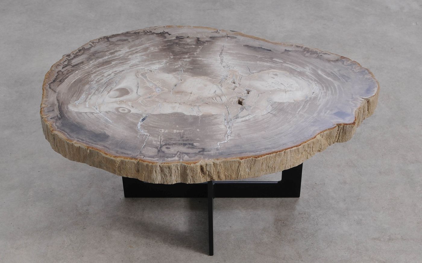 Deze unieke salontafel van versteend hout past in ieder interieur. Het tafelblad is gezaagd uit een grote versteende boom, die ongeveer 20 miljoen jaar geleden geleefd heeft. De kleuren zijn bepaald door de mineralen die het hout van deze boom vervangen hebben.
