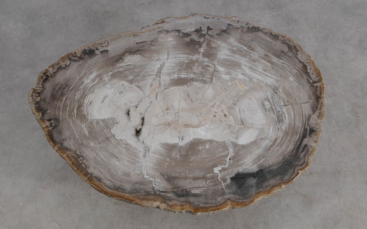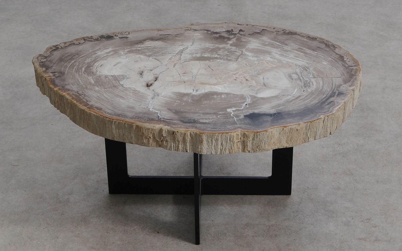 Deze unieke salontafel van versteend hout past in ieder interieur. Het tafelblad is gezaagd uit een grote versteende boom, die ongeveer 20 miljoen jaar geleden geleefd heeft. De kleuren zijn bepaald door de mineralen die het hout van deze boom vervangen hebben.
