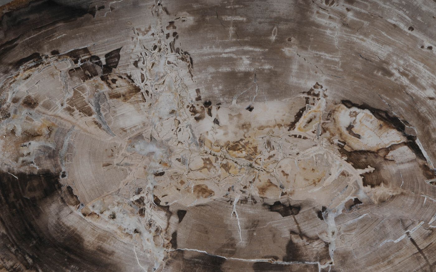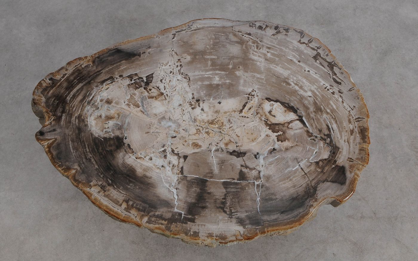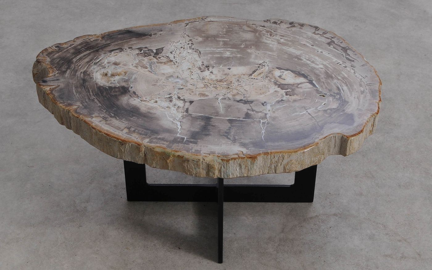 Deze unieke salontafel van versteend hout past in ieder interieur. Het tafelblad is gezaagd uit een grote versteende boom, die ongeveer 20 miljoen jaar geleden geleefd heeft. De kleuren zijn bepaald door de mineralen die het hout van deze boom vervangen hebben.