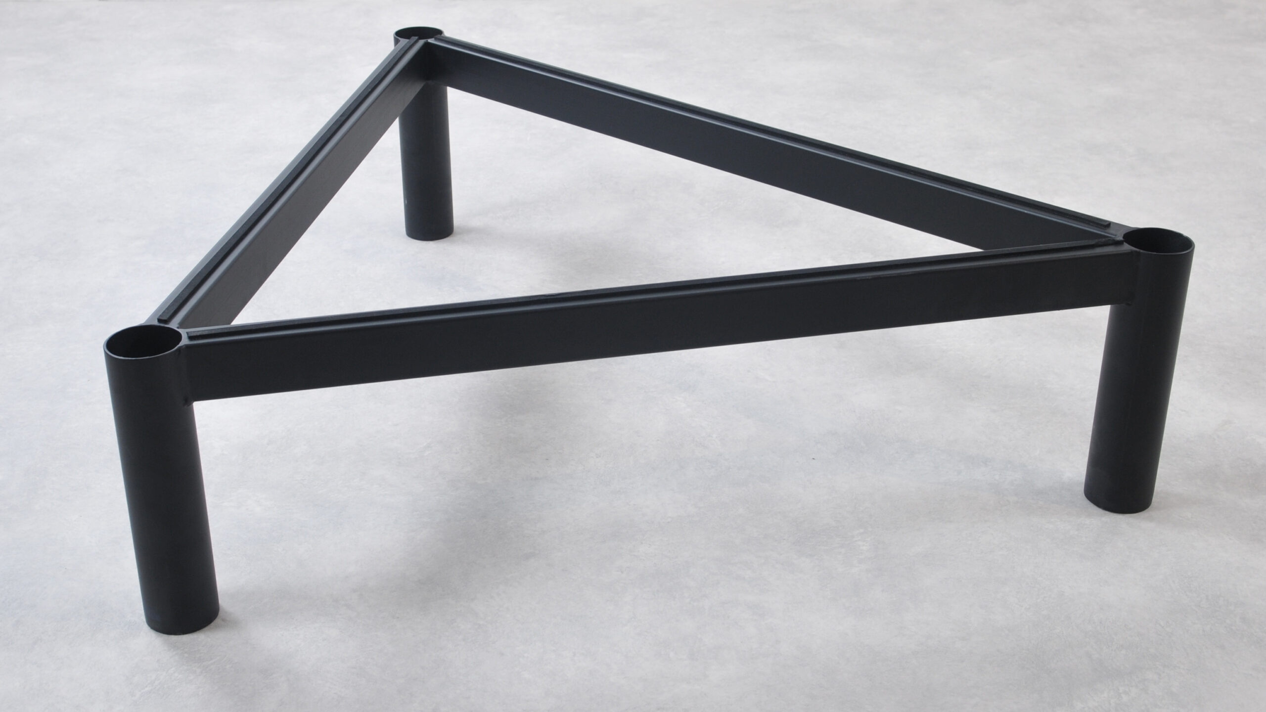 Met een tripod frame zie je alleen drie ronde poten. De koker voor de poten kan variëren in dikte; bijvoorbeeld 30 mm, 50 mm of 80 mm. De onderkant van de poten laten we dichtlassen, zodat je geen kunststof dop nodig hebt. Onder de poten bevestigen we professioneel vilt.